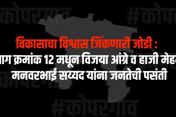 कोपरगाव नगरपरिषद निवडणुकीच्या पार्श्वभूमीवर प्रभाग क्रमांक १२ मध्ये विकासाभिमुख व समाजाभिमुख नेतृत्वाला नागरिकांचा ठोस पाठिंबा मिळताना दिसत आहे. विजया आंग्रे व हाजी मेहमूद मनवरभाई सय्यद यांनी सातत्याने केलेल्या समाजकार्यामुळे आणि प्रभागाच्या विकासासाठी घेतलेल्या पुढाकारामुळे मतदारांमध्ये त्यांच्याविषयी विश्वास निर्माण झाला आहे. प्रभागातील रस्ते, पाणीपुरवठा, स्वच्छता, नागरी सुविधा तसेच सर्वसामान्य नागरिकांच्या अडीअडचणी सोडवण्यासाठी या दोघांनी कायम सक्रिय…
